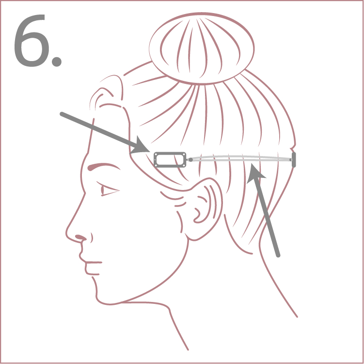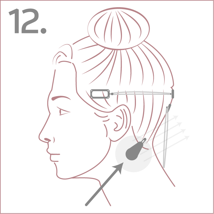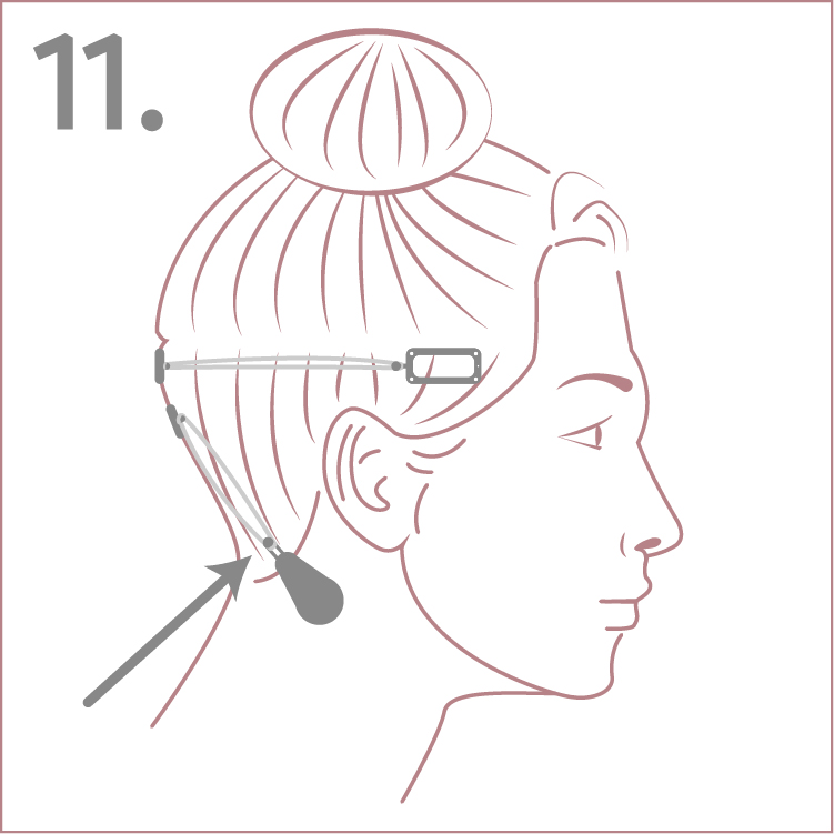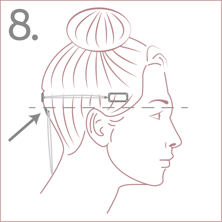 8. At about ear level, or 1” below the top center clip, attach the bottom center clip—plastic side down.